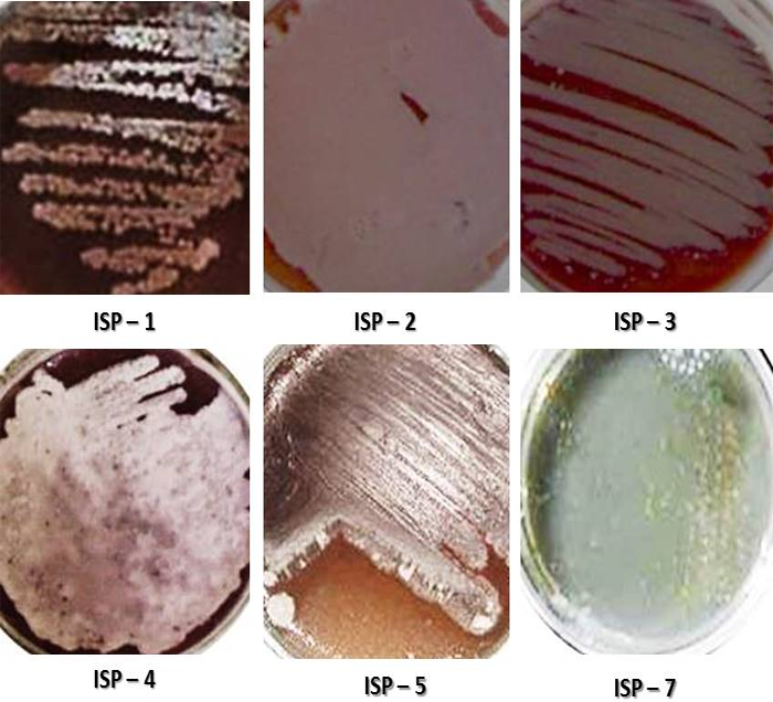 Actinomycetes were isolated by serial dilution method according to Janaki, et al. [11] with some modifications. Stock solution of prepared soil samples were performed using serial dilution method and inoculated on starch nitrate agar plates. The inoculated plates were incubated at 28ºC for 2 to 3 weeks. The appeared colonies were picked and purified according to color, dryness, rough, convex colony [12].