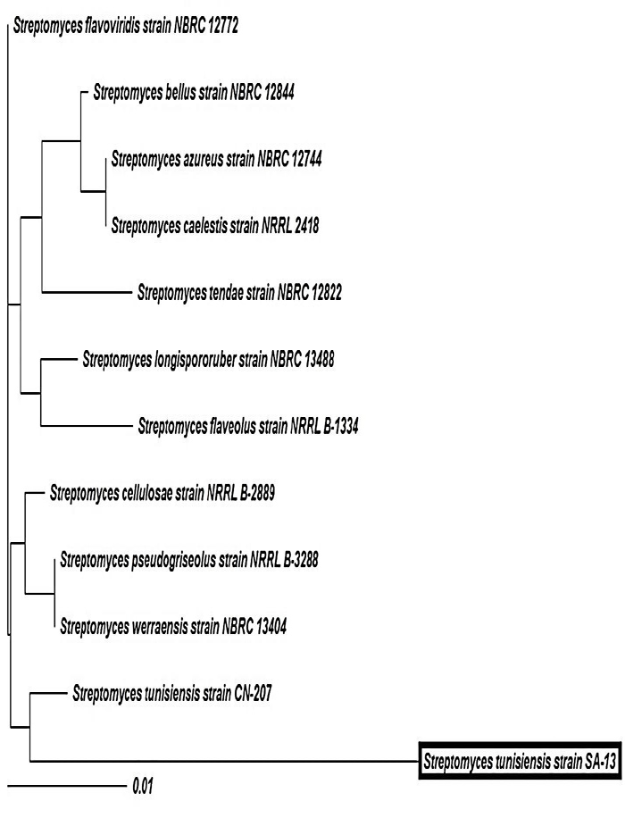 Fig-3. Phylogenetic tree showing the relations between SA-13 isolate and the most closely related type strains of Streptomyces based on 16S rDNA sequence alignment.