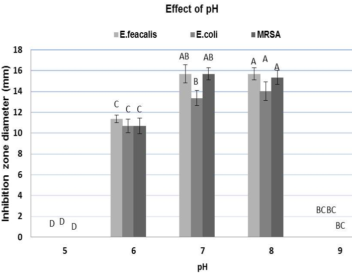 Figure-5. Effect of different pH on the antimicrobial activity of Streptomyces tunisiensis SA-13
