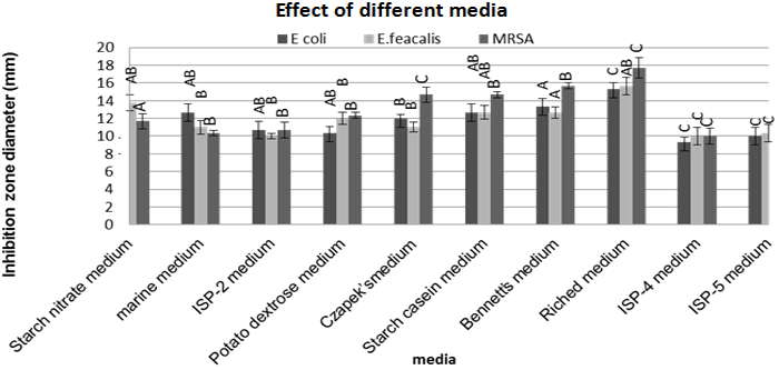 Figure-6. Effect of different culture media on the antimicrobial activity of Streptomyces tunisiensis SA-13