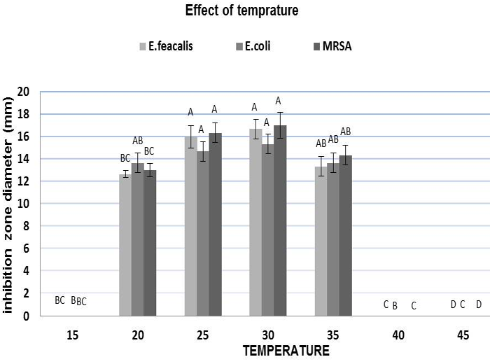 Figure-7. Effect of incubation temperature on the antimicrobial activity of Streptomyces tunisiensis SA-13