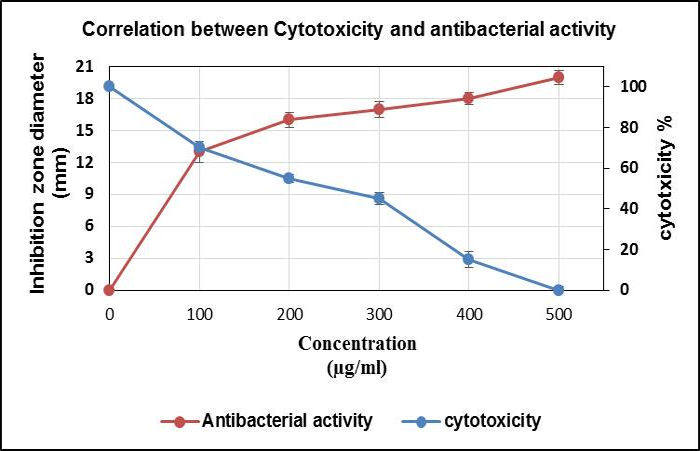 Figure-8. Correlation between cytotoxicity of Streptomyces tunisiensis SA-13 crude extract on VERO cells and antimicrobial activity against Enterococcus feacalis