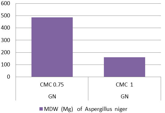 Figure-1. Mycelial dry weight (MDW) of Aspergillu s niger on beet foliage DPJ after the addition of carboxymethyl cellulose at various concentrations.