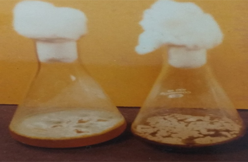The same experiment was conducted to observe the results in case of fungi Penicillium notatum illustrated in Table 2. Penicillium notatum was grown on both DPJ of lucerne and beet leaves. In order to enhance its mycelial biomass attempts were made to add the substrates viz., starch, casein and CMC depicted in Figure 2.