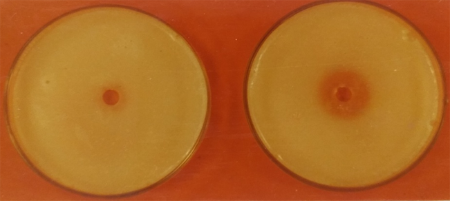 The basal medium composed of 2 % agar, 4 % gelatin, 1 % peptone, 1 % casein and pH was adjusted to 6.8. In this assay, casein acts as a substrate [22].