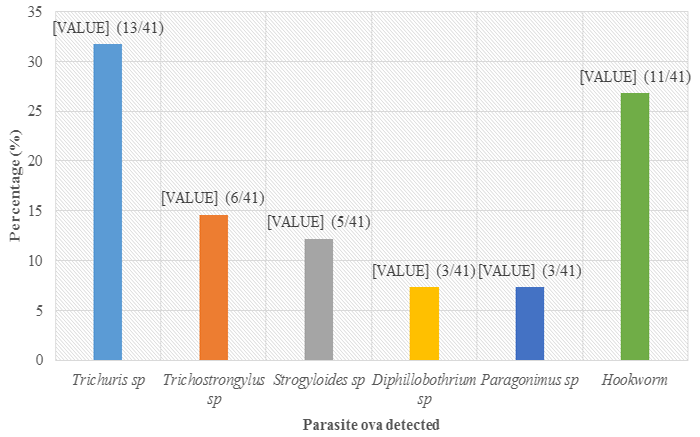 Six parasite species were detected in egret droppings collected (Figure 8). Out of the 41 parasites counted, 31.7% (13/41) were Trichuris spova, while 26.8% (11/41) were hookworm ova. The relative abundance of the remaining parasite ova detected is shown in Figure 8.