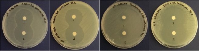 Figure-9. Antibacterial activity of 500mg Ampicillin solution on the tested bacteria- E.coli, P. vulgaris, P. aeruginosa & S. aureus (from L-R).