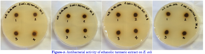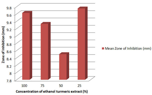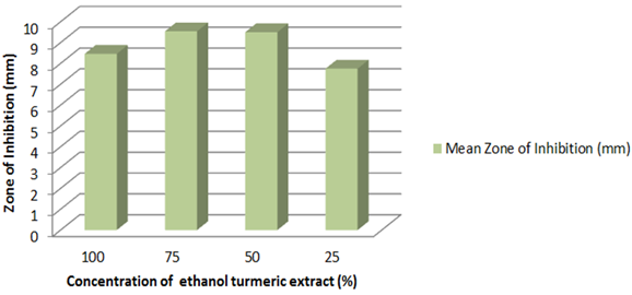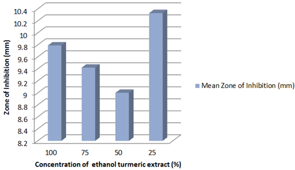 In contrast to the results of this present study, previous studies showed that as the concentration of the ethanolic turmeric extract increased so did the zones of inhibition [11]. Furthermore, to have comprehensive knowledge for such deviations in this present study in comparison to previous studies such as Mukhtar and Ghori’s; tests and analyses have to be conducted to investigate the mechanism of action that the extract has against the tested bacteria. Some possible reasoning for deviations may include the diffusion rate of the ethanolic turmeric extract which may have been influenced by the concentration make-up (crude extract: ethanol ratio) as well as the type of filter paper used as discs. Although some of the antibacterial activities of turmeric are well-documented, their antibacterial capacity in vitro may vary on a wide basis depending on several factors such as the difference in nature of the plant, tested organisms, test medium, and different methods [17].