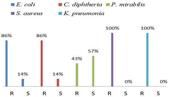 Figure 1 shows the percentage susceptibility pattern of the isolated Bacillus species metabolites against test organisms. P.mirabilis was 43% resistant and 57% susceptible, .E. coli and C. diphtheria were 86% resistant and 14% susceptible, while S. aureus and K. pneumoniae were 100% resistant and not susceptible to the isolated Bacillus species.