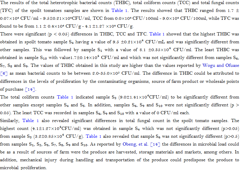Table 1. Total heterotrophic bacteria, coliforms and fungal counts of spoilt tomatoes.
