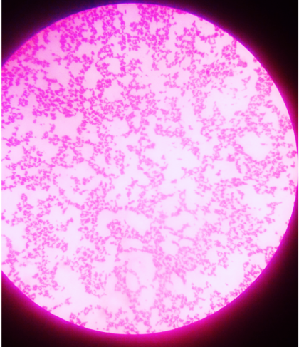 The slides were flooded with crystal violet (primary stain). After one minute, the slides were rinsed with tap water. Next, the slides were flooded with iodine (a mordant) that binds to the crystal violet. The mordant property of iodine prevents it from exiting the Gram-positive peptidoglycan cell wall. After one minute, the slides were rinsed gently with tap water. Then, the slides were flooded with an acetone-isopropanol mixture used as decolouriser to remove stains from the Gram-negative cells. After about 10-15 minutes, the slides were rinsed gently with tap water. Next, the slides were flooded with Safranin (counter-stain). After 10 minutes, the slides were rinsed with tap water. Then, the slides were drained and allowed to air-dry in an upright position.  Finally, the slides were examined under oil immersion (1000x times magnification) using a bright field compound microscope.