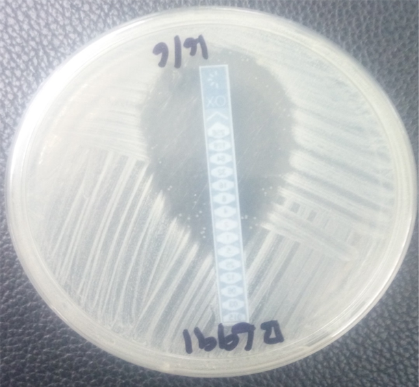 For greater zones of inhibition where growth of the organism does not intersect with the strip, the MIC should be read as less than the lowest value of the strip. However, this large zone of inhibition was not observed in our study.