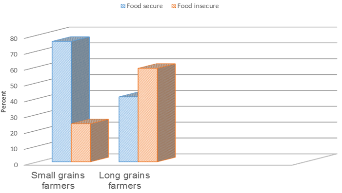 The obtained results show that a greater percentage of small grains farmers are food secure as compared to long grains farmers. Furthermore, more than 50 percent of long grains farmers reflected that they were food insecure. This indicates that small grains farming households had access to a greater variety of foods which they afforded to purchase using mainly income obtained from sale of the harvested small grains as compared to long grains farming households.
