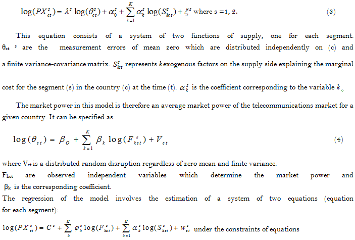 Telecommunication means any transmission, emission or reception of signs, signals, writings, images, sounds or information of any kind, whether by wire, mediums, optical or other electromagnetic system. This sector includes fixed telephony, mobile telephony, the Internet... The development of this sector is an asset for a country’s economic growth since it improves the labor productivity and creates added value for firms. In the last two decades, the implementation of trade liberalization policies failed to stimulate global economic performance in most developing countries. This is particularly the case for African countries, which remain marginalized in international trade. The African and the Middle East region represented only 4.4 percent in 2004 in the telecom sector against 54.2% in Europe (Mezouaghi, 2006).