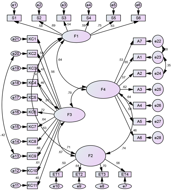 IBM SPSS AMOS software was used to develop a structural equation model (SEM) and to interpret standard multivariate analysis including factor analysis, correlation, regression and analysis of variance. Skills, education and training, knowledge, competencies and attitudes have been considered as exogenous variables. Organisational performance has been considered as an endogenous variable. All the items or observed variables under each latent variable have been used to a form-measured model.