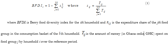 This study used the Berry Index and the USAID's Food and Nutrition Technical Assistance (FANTA) 's Household Dietary Diversity Score (HDDS) to evaluate domestic remittances' impact on household food diversity (Swindale & Bilinsky, 2006b). The Berry Index values range between zero and one; the higher the index value, the greater the degree of diversity in food consumption. Suppose a household's total food spending is on a single classified food-group. In that case, the Berry index is zero (implying no food diversity) while coming close to unity if it spreads among a number of food groups (Berry, 1971). The Berry Index as a measure for each household food diversity is given in Equation 1 as: