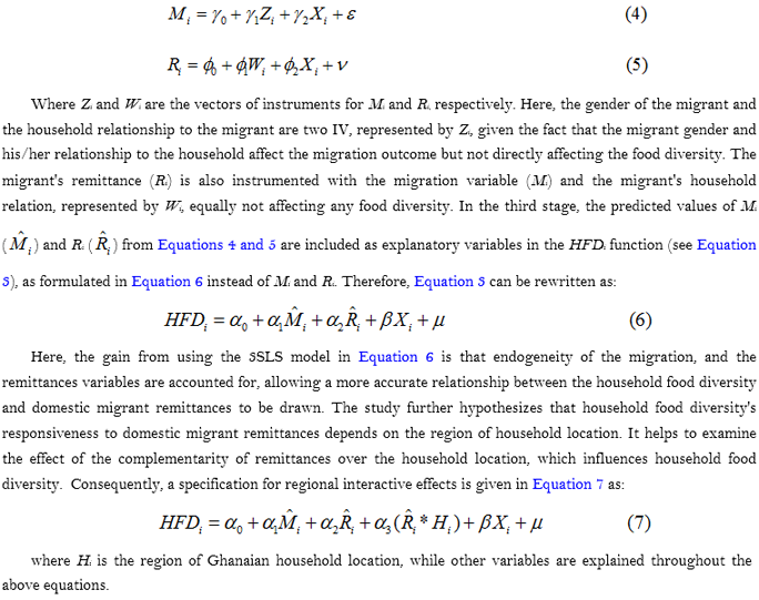 Since Miand Ri are endogenous, a three-stage least squares model (3SLS) was estimated by identifying instrumental variables (IV) for Mi and Ri (Kaninda & Fonsah, 2014; Quinn, 2009). In the first and second stages, OLS equations were estimated. Since the remittances and migration variables were continuous, the OLS was implemented for both Ri and Mi, of which the two equations can be expressed as: