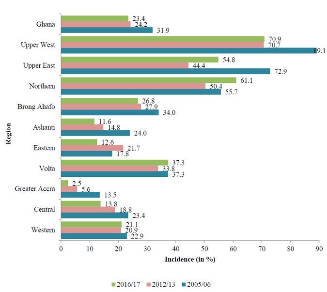 Figure-1. Poverty incidence in Ghana by region (Poverty Line (annual household income) = GH₵1,314 or US$292; US$1= GH₵4.50; exchange rate of 2017 (annual average))