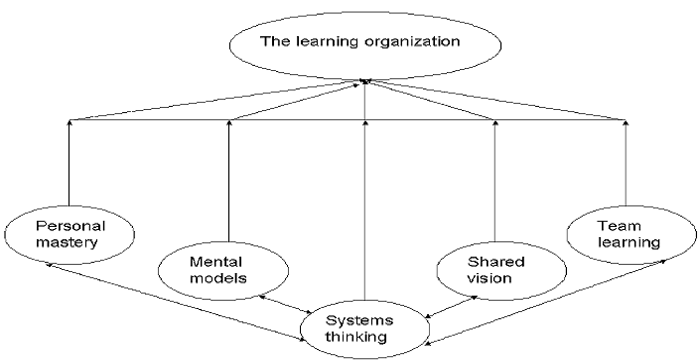 Senge (1990) described learning organizations as “organizations where people continually expand their capacity to create the results they truly desire, where new and expansive patterns of thinking are nurtured, where collective aspiration is set free, and where people are continually learning to learn together” (Senge, 1990). He classified five disciplines (see Figure 1) as a chain of principles and practices that support the learning organization, namely personal mastery, mental models, shared vision, team learning, and systems thinking. He stressed that, for an organization to learn, each of the five characteristics “must be in evidence” (Tait & Blinco, 2014).