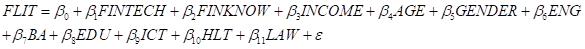 The relationships between Fintech usage, demographic factors and financial literacy are investigated in this study using a preliminary investigation through the Pearson correlation coefficient. To further investigate the influence of Fintech adoption on financial literacy, an Ordinary Least Squares regression analysis is conducted. The demographic factors of gender, income, age and profession (as dummy variables) have also been included. The model specification is as follows: