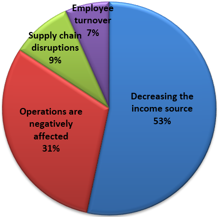 Respondents were also asked for their thoughts on the impact of the COVID-19 pandemic on business. Their responses included: decreased sources of income (53.33%); operations negatively affected (30.87%); supply chain disruptions (9.12%); employee turnover (6.66%) (Figure 2). In this context, the critical focus should be on job creation, domestic production and income collection (Subba, 2020).