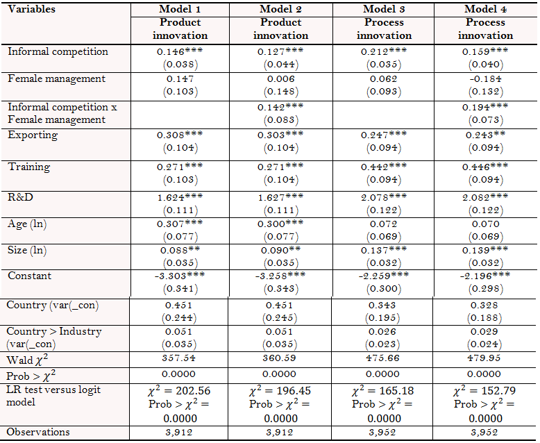 Table 2 shows the summary statistics for the main variables that were employed in the study. Out of all the companies, 22% of the sample engaged in product innovation, and nearly 35% of firms reported process innovation. The average rate of informal competition was 1.15, which is between “a minor obstacle (1)” and “a moderate obstacle (2)”. More than 31% of firms had female top managers. Moreover, approximately 32% of firms in the sample carried out exporting activities. In addition, more than 31% of firms provided training for employees, and more than 15% of firms conducted R&D activities.