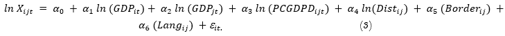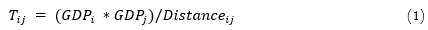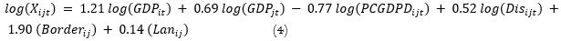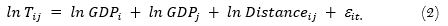 Equation 1 shows the basic gravity model of trade, in which total trade positively depends on the GDP of the trading countries and negatively relates to the distance between the countries. In this equation, Tij denotes the bilateral trade between participating nations i and j, GDPi and GDPj represent their gross domestic products, and Distanceij shows the distance between the capitals of countries i and j. Taking the logarithmic of Equation 1, the following equation for the basic gravity model is obtained: