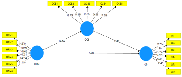 The variable path coefficient HRM to OCB has a positive value of 0.790. H2 is accepted, and the P-value of 0.017 indicates that HRM significantly improves OP. The HRM variable path coefficient against OP has a value of 0.281.  H3 is accepted, indicating that OCB significantly improves OP with a P-value between 0.000 and 0.5.