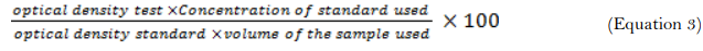 A 0.5 g each of the samples was weighed into 50 mL Kjeldahl flask and 5 mL concentrated sulphuric acid was added with a catalyst. The flask was treated gently then strongly until it digested completely leaving a clear (grey-white) digests. It was allowed to cool, filtered, washed and made up to 50 mL volume of the volumetric flask. The digest was distilled with 40% sodium hydroxide through 5 mL 2% boric acid solution. Three drops of mixed indicator were used and 40 mL of each sample was collected and back titrated using 0.01 M HCl. The % Nitrogen content was calculated according to the equation (equation 2)