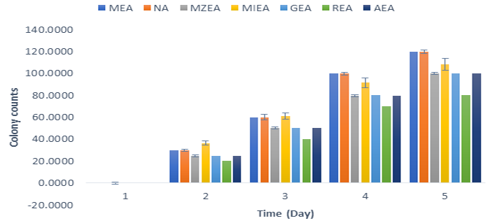 Growth rates of Klebsiella on MEA and NA were almost the same in day 5 of the experimental period. However, there was a significant difference in growth between NA and MzEA, MzEA and MiEA, MiEA and GEA, GEA and REA. Similarly, a significant difference in growth existed between REA and AEA. The highest growths were on MEA and NA however, MiEA best growth environment amongst the formulated media.