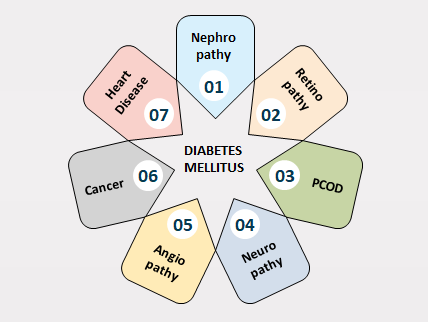 It has been reported by WHO that one in three adults (over the age of eighteen years) and one in ten individuals, resembles overweight and obese respectively, which are the major driving factors for T2DM and its prevalence, amongst other factors including age, lifestyle, diet which is acknowledged in many studies (Sami et al., 2017; Zheng et al., 2018). The raised blood glucose level causes severe damage to internal organs of the body due to which it has now become a leading cause of morbidity and fatality. Now a day’s diabetes and related disorders are considered as the consistent burden on the health care system. The diabetes-induced complications are categorized on the basis of severity as Acute, Chronic and other complications. Acute complication includes hypoglycemia, hyperglycemic crises, Diabetes ketoacidosis and hyperglycemic hyperosmolar state (HHS), while the chronic complications consists of microvascular (diabetic retinopathy, nephropathy and neuropathy) and macrovascular complications and other complications comprises of hypothyroidism, limited joint mobility, impaired growth and infection among others (Henry, 1987; Deshpande et al., 2008; Baynes, 2015). Figure 1 illustrates the complications induced by diabetes.