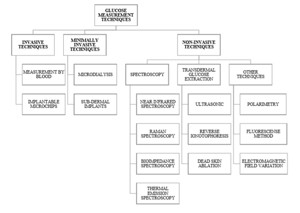 The third group comprises sensors based on Non-invasive glucose monitoring such as GlucoWatch G2 Biographer by Cygnus Inc, Pendra by Pendragon Medical Switzerland, C8 Medisensors, Gluco Wise by MediWise Ltd among some others (Lin et al., 2017) which work on the principle of methods like spectroscopic techniques, transdermal glucose extraction techniques and some other techniques. The Spectroscopy involves the study of emersion or absorption of light by the substance based on their wavelength spectrum. Spectroscopic techniques are further divided into near Infrared Spectroscopy, Mid Infrared Spectroscopy, Raman Spectroscopy, Bioimpedance Spectroscopy and Thermal Emission Spectroscopy. In Transdermal Glucose Extraction Technique, the physical energy is used so that we can access the interstitial fluids and extract glucose levels. These techniques include Sonophoresis, Reverse Iontophoresis and Dead skin ablation, Polarimetric method, Fluorescence method and Electromagnetic Field Variation methods are some other techniques for the measurement of glucose level in the body (Losoya-Leal et al., 2012; Nawaz et al., 2018). The blood is the most studied body fluid for glucose measurements but other more accessible biological fluids such as interstitial fluid, ocular fluid, sweat, breath, saliva and urine have also been inspected as other samples for non-invasive glucose monitoring techniques (Bruen et al., 2017). The following chart displays the various technologies used for glucose monitoring (Fig.2)