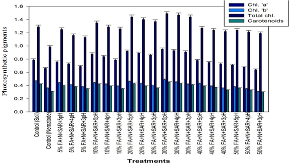 Figure-2. Graph shows the combined effect of FA, SAR and root-knot nematode on photosynthetic pigments in pumpkin Var. Nutan.