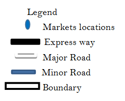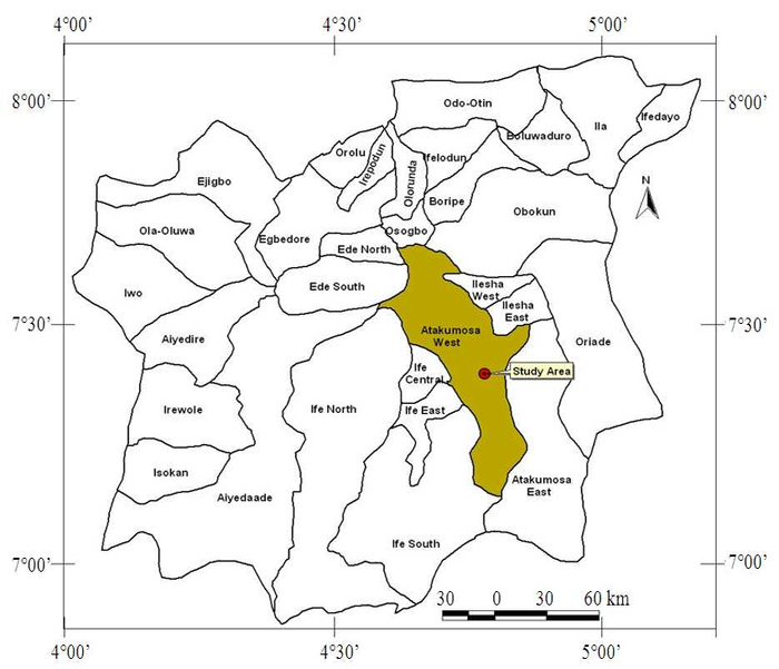 Figure-1 . Osun State map showing the different yam and plantain sample collection sites marked with blue color.