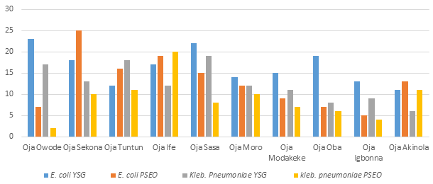 Note: E.coli YSG= E.coli isolated from yam flour samples; E.coli PSEO= E. coli isolated from plantain flour samples; K. pneumoniae YSG= K. pneumoniae isolated from yam flour sample; K. pneumoniae PSEO= K. pneumoniae isolated from plantain flour samples