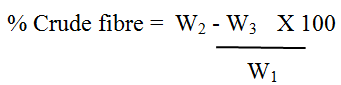 A 2g of each defatted sample was weighed into a 1L conical flask. 200ml of 1.25% sulphuric acid was added and the content was boiled for 30minutes. The mixture was filtered under vacuum followed by repeated washing with distilled water after which the sample was returned to the flask with the addition of 200ml of 1.25% NaOH solution. The mixture was boiled again for 30minutes and filtered. The sample was thoroughly washed with distilled water followed by 10% HCl solution and further washing was done to free the sample of any adhering acid. This was further treated with 10ml of light boiling petroleum ether and 10ml of ethanol (100%). The sample was scooped back into an empty crucible and placed in a hot-air oven set at 105 0C to dry for 1hr. After drying, it was placed in a desiccator and allowed to cool to room temperature and weighed. This was then placed in a muffle furnace and ashed for 90 minutes, allowed to cool to room temperature and weighed again . The crude fibre was calculated thus: