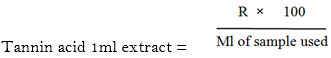A 0.2g of finely grounded sample was weighed into a 50ml sample bottle, 10ml of 70% aqueous acetone was added to it and mixed thoroughly. The bottles were kept ice bath shaker and shaken for 2 hr at 30 0C. Each solution was then centrifuged and the supernatant stored in ice. 0.2ml of the solution was pipetted into a test tube and 0.8ml of distilled water was added. Standard tannin acid solutions was prepared from a 0.5mg/ml of the stock and the solution made up to 1ml with distilled water. A 0.5ml of Folin Ciocaeteau reagent was added to both sample bottles and standardized by pipetting 2.5ml of 20% Na2CO3. The bottles were vortexed and incubated for 40 min at room temperature after which its absorbance was read at 725nm using AJ- IC03 spectrophotometer against a reagent blank concentration of the same solution from a standard tannic acid curve that was prepared (AOAC, 2012).