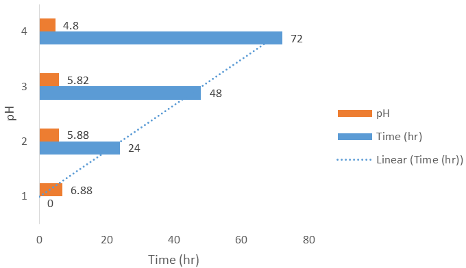 Figure-1. Changes in pH during the fermentation of banana peels. The pH was observed to decrease with increase in fermentation time. The temperature ranged from 6.88 at 0 hr to 4.8 at 72 hr during the fermentation process.