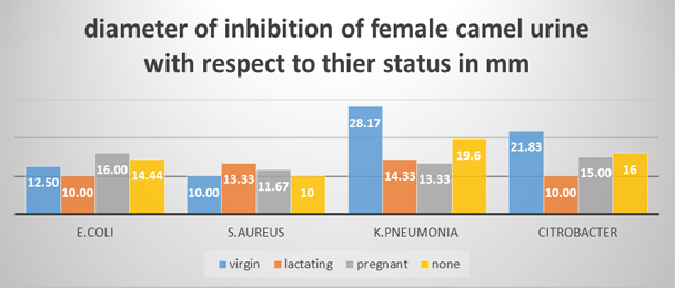 With respect to the female camel states, female urine has shown mean inhibition against bacterial pathogens ofNone (15.02 mm), pregnant (14 mm) lactating (11.9 mm) and virgin (18.125 mm), which shows that virgin camel urine are most effective among the other camel status followed by camels with none of statuses mentioned and pregnant while lactating camels are the camels with lowest effective urine against bacterial species tested on Figure 4. The finding also exposed that camel urine has minimum inhibitory concentration of Klebsella Pneumonia (12.02 %), Citrobacter (8.2 %), Escherichia Coli (12.5 %,) and Staphylococcus aureus (10.6%) Table 4. It is also very significant and discloses that even low concentration of camel’s urine have ability to inhibit the growth of bacterial pathogens and this study is similar with Humaid (2016) and another study in Kingdom of Saudi Arabia (Al-harbi, 2010).