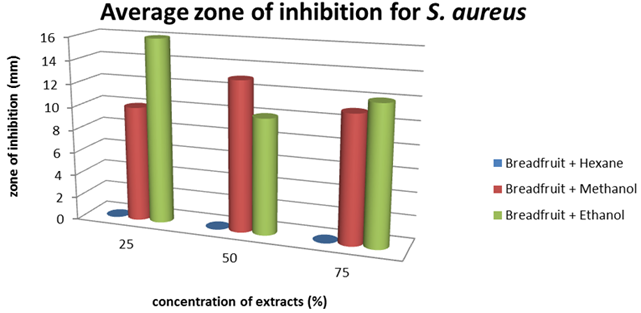 Breadfruit extracts were first investigated against Staphylococcus aureus. The results in showed that 25% ethanol extracts gave the highest average zone of inhibition followed by 50% methanol and 75% ethanol extract. This indicated that the lowest plant extract concentration was most effective against the bacterium.