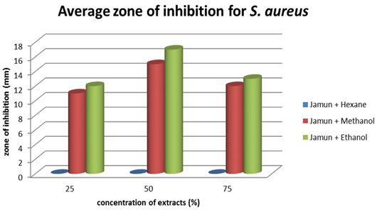 Figure-3. Graph showing average zone of inhibition for Jamun extracts against S. aureus.