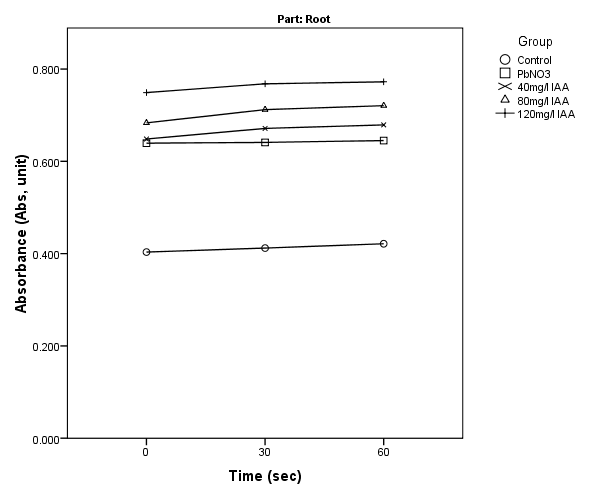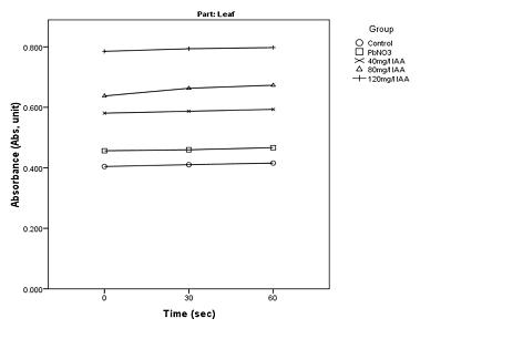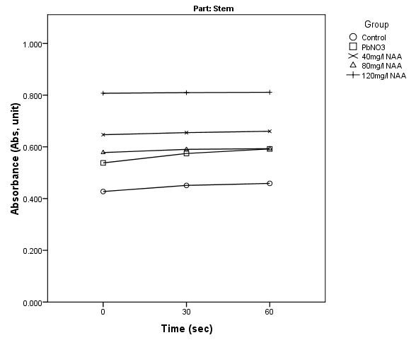 The result in Table 5 and 6 shows that in the root, 120mg/L IAA significantly increased the level of Ca2+, Mg2+,Fe2+,Zn2+ and phosphorus, 80mg/L IAA significantly increased level of Mg2+,K+,Fe2+,Zn2+, 40 mg/L IAA gave no significantly increased the level of these mineral elements. 120mg/L NAA significantly increased the level of Ca2+,Mg2+,K+,Na2+,Fe2+,Zn2+,P. 80mg/L NAA significantly increased the level of Mg2+,K+,Fe2+,Zn2+ and P, 40mg/L NAA significantly increased the level of Mg2+,K+,Fe2+,Zn2+,P.  All concentration significantly decreased the level of Pb2+ except 40mg/L IAA. In the stem, 120mg/L IAA significantly increased the level of Ca2+,Mg2+,Fe2+,K+ and P, 80mg/L IAA significantly increased level of Ca2+,Mg2+,K+,Fe2+ and Zn2+, 40 mg/L IAA  significantly increased the level of Ca2+,Mg2+,Fe2+ and phosphorus. 120mg/L NAA significantly increased the level of Ca2+,Mg2+,K+,Na2+, Fe2+, Zn2+ and P. 80mg/L NAA significantly increased the level of Mg2+, Ca2+,Fe2+ and P, 40mg/L NAA significantly increased the level of Ca2+ Mg2+,K+,Fe2+,Zn2+,P.  All concentration significantly decreased the level of Pb2+. In the leaf, 120mg/L IAA significantly increased the level of Ca2+,Mg2+,K+,Fe2+ and Zn2+,80mg/l IAA significantly increased level of Ca2+,K+,Fe2+  and Zn2+, 40 mg/L IAA  significantly increased the level of Fe2+ and Zn2+. 120mg/L NAA significantly increased the level of Ca2+, Na+ ,Mg2+,K+, Fe2+ and Zn2+. 80mg/L NAA significantly increased the level Fe2+ and Zn2+, 40mg/L NAA significantly increased the level of Ca2+ Mg2+,Fe2+ and Zn2+. All concentration significantly decreased the level of Pb2+ except 40mg/L IAA. This also follow the work of Chandra et al. (2011) that reported alleviating effects of indole acetic acid on adverse effect of toxic heavy metal (Pb, Cd, Cr) and increase in  the nutrient uptake of Zinc and Iron in wheat (Triticum aestivum L) .  Also Rui-Jun et al. (2011) reported that application of IAA alleviate Pb toxicity by creating better root system, plant biomass and regulating the level of nutrient element. Mona, Maymona, and Ibrahim (2013) also reported that foliar application of mixture of IAA+NAA promote nutrient element (N, P, K ,Fe, Zn, Mn) in barley.  Khan, Khan, Sahreen, and Bokhari (2010) reported that application of 0.5m MSA result in an increase of N,P,K & Ca content by 10.1%, 31.6%,19.3% & 19.1% respectively in mungan bean.