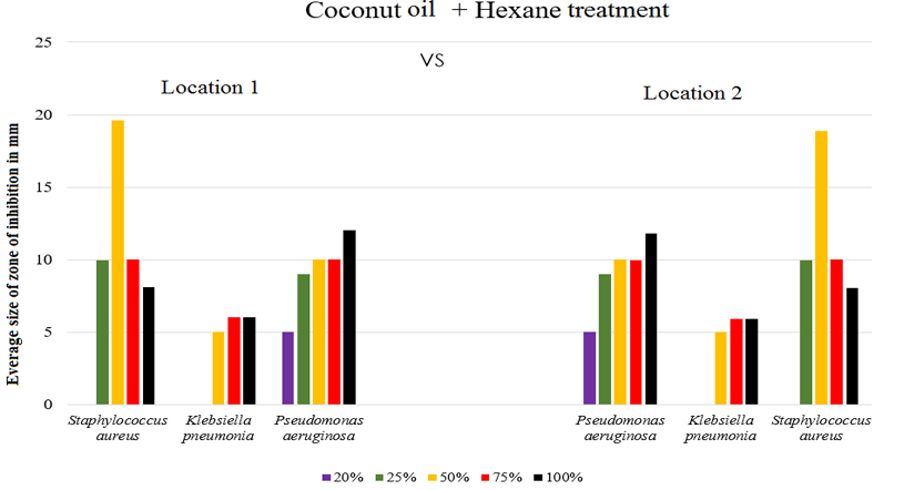 Figure 1. The comparison of the average zone of inhibition formed using coconut oil and hexane in different concentrations from “location 1” and “location 2” against staphylococcus aureus, Pseudomonas aeruginosa, and Klebsiella pneumonia.