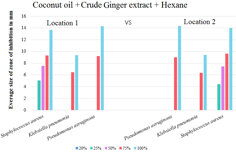 Figure 3.he comparison of the average zone of inhibition formed using coconut oil + crude ginger extract and hexane in different concentrations from “location 1” and “location 2” against Staphylococcus aureus, Pseudomonas aeruginosa, and Klebsiella pneumonia.
