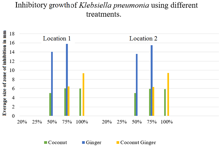 According to the results obtained from this research the researcher observed the following findings; the crude ginger extract was tested to be most effective against Staphylococcus aureus and least effective against Pseudomonas aeruginosa. The coconut oil extract was tested to be most effective against Staphylococcus aureus and least effective against Klebsiella pneumonia. The combination of coconut oil and crude ginger extract was tested to be most effective against Staphylococcus aureus and least effective against Klebsiella pneumonia. When using 100% crude ginger extract against Staphylococcus aureus, the largest zone (23mm) was formed when using this treatment. When using 50% of the coconut oil extract against Staphylococcus aureus, the largest zone (18mm) was formed using this treatment. When using 100% crude ginger extract mixed with coconut oil against Pseudomonas aeruginosa, the largest zone (15mm) was formed when using this treatment. It concludes that the treatments tested against the organism showed antimicrobial activity and that they possess great potential as antimicrobial agents. The researcher however suggests for the best results to be obtained, a wider range of solvent should be used plant extracts should be tested against fungus in order to do a comparison against bacteria and the use of pure ginger extracts.
