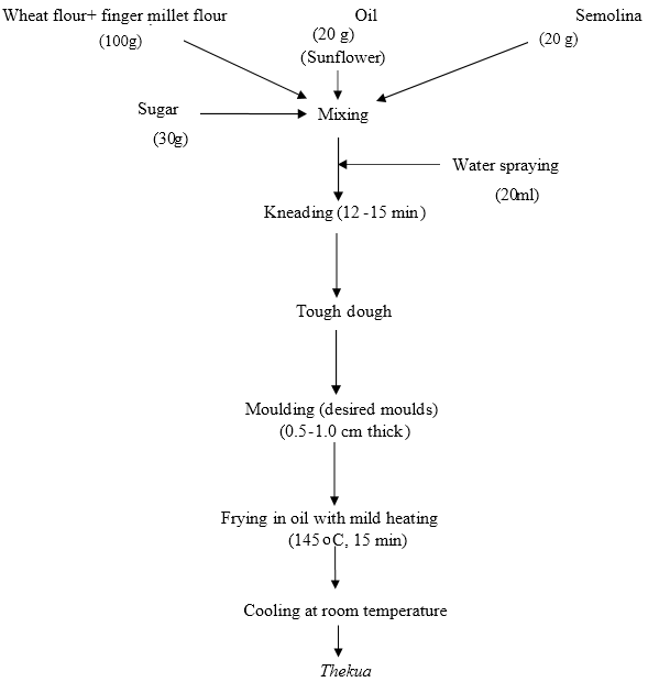 Thekua was prepared as that of Sah (2019) with slight modifications Figure 1. Finger millet was germinated before being grounded into flour and the flour was used with white wheat flour to make thekua. Semolina (20 g), sugar (30 g), oil (20 g) and water (20 g) were kept constant for every formulation Table 1.