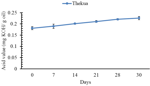 The best product sample ‘E’ was packed in low density poly-ethylene (LDPE) plastic packets and stored at normal room condition. Moisture content, free fatty acid and acid value in laboratory upto 1 month in an interval of 7 days Figure 3, 4 and 5. For the analysis of free fatty acid and acid value, oil extraction of thekua was done and the oil was kept for further analysis upto 1 month. The values were below the unacceptability level of maximum as described by Mukhopadhyay (1990) till the last date of analysis. The rate of increase in moisture content (%), free fatty acid (% as oleic acid) and acid value (mg KOH/g oil) of best product sample ‘E’ with respect to shelf-life analysis was found to be 0.0125, 0.00076 and 0.0015 respectively. These rates may accelerate after storage period of 30 days. The rate of increase of acid value, moisture content and free fatty acid can be decreased with the use of better packaging materials, better storage condition and by use of antioxidants and preservatives.
