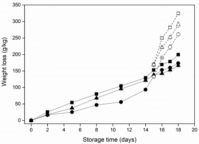 Figure 4 shows a bi-plot of the first and second principal components from the PCA analysis. Separation between the control and the two coating conditions could be achieved using the first two principal components. Together these two principal components accounted for 78 % of the explained variance. The bi-plot also show how the coating conditions correlated with the measure physicochemical properties. Physicochemical parameters found around a given coating condition indicate a close association with that coating condition. For example, a*- and b*-values were closely associated with the control fruit, showing that fruit colour was significanlty afffcted in the control fruit. Pearson correlation analyses also revealed a strong negative correlation between weight loss and firmness, which can also be observed in the bi-plot of Figure 4.