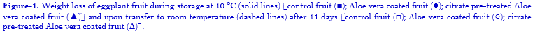 The high rate of weight loss recorded for fruit transferred to room temperature after 15 days can be partly explained by an increased rate of metabolic activities or higher rate of moisture evaporation caused by the higher environmental temperature. Pre-treatment of eggplant with citrate was not effective in further reducing weight loss compared to only the coated fruit.