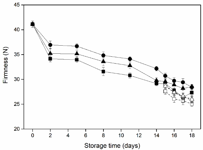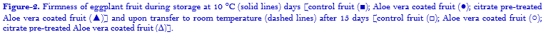 The pre-treatment of eggplants with citrate did not improve fruit firmness compared to the Aloe vera coated fruit. At ambient- storage temperature, differences in fruit firmness between coated and uncoated eggplant fruit was not significant, showing that low temperature storage is still relevant for decreasing firmness loss of fruit after Aloe vera coating.